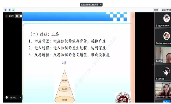在讲座中,杨江峰博士从“三表”(表面、表层、表演)走向“三深”(深刻、深层、深情),形成“三感”(意义感、自我感、效能感),培养高阶思维品质,通过“三效”(效能、效率、效果)课堂产生高峰体验,孕育“心流”,“三度、三层、四环”(334模式)运行机制等维度形象描述了“深度·增值”教学流派的根本特点,并介绍了该流派在深圳中小学进行的教育实践。